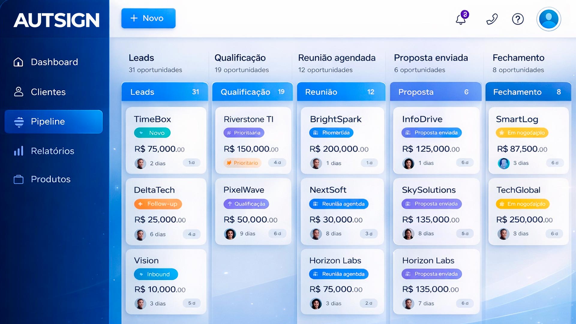 Sim. A AUTSING permite visualizar o funil completo, acompanhar negociações em andamento e entender exatamente onde as vendas estão avançando ou travando.